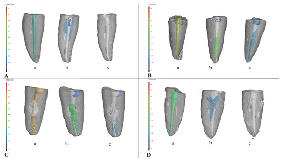 Three-dimensional model of a single canal tooth obtained by micro-CT scanning: (a)—after root canal filling; (b)—after re-treatment with Reciproc instruments; and (c)—after additional SWEEPS treatment. Root canal filling and the root canal filling remnants are colored according to the volume of the root canal filling in: (A) Group 1: single-cone group, AH Plus + gutta-percha; (B) Group 2: single-cone group, TotalFill BC+ TotalFill BC Points, (C) Group 3: core-carrier group AH Plus + Guttafusion; (D) Group 4: core-carrier group, MTA Fillapex + Guttafusion.