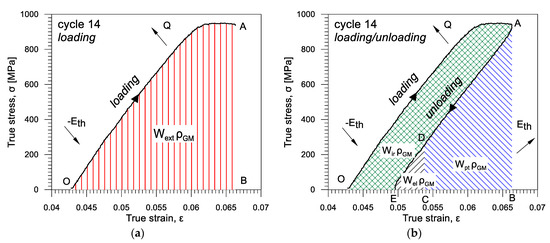 In the case of materials demonstrating stress-induced transformation, e.g., shape memory or superelastic alloys, such as Gum Metal, the analysis of energy balance is more complex, since the exothermic forward and the endothermic reverse transformations should be taken into account as well. An approach to analyze energy balance during the Gum Metal deformation is demonstrated in Figure 5a,b, respectively. The loading–unloading cycle 14 (see Figure 2) was chosen for the analysis since, for such an advanced loading stage, various factors contribute to the process of the Gum Metal deformation; thus, all energy components can be considered.