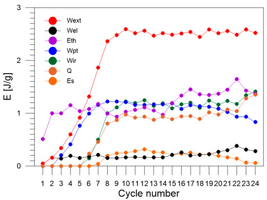 The values of the energy estimated via the energy balance and the ratio (Equation (3)) for each loading–unloading cycle are listed in Table 2. The obtained energy components, , , , , , , , estimated for each of the 1–24 loading–unloading cycles, are compared in Figure 7. In the next figures, selected energies are compared, i.e., estimated values of energy: , , and are shown in Figure 8; values of and in Figure 9; and values of energy and in Figure 10, respectively.