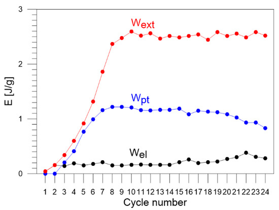 Thus, in this paper we try to demonstrate how the energy expended on plastic deformation Wext, as well as the particular energy components, including those associated with pure elasticity (thermoelastic effect) Eth and the superelastic-like mechanically recoverable deformation Wpt, change and develop during each of the 1–24 loading–unloading tension cycles.