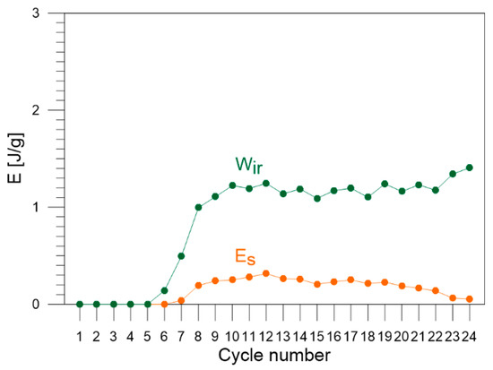 In the early cycles 1–6, the values of stored energy of Gum Metal estimated for each cycle of tensile loading are equal to 0, since there is no or only a little plastic deformation. In cycles 8–20, the values of are in the range between 0.12 J/g and 0.25 J/g. Finally, in cycles 21–24, the values of drop because the heat Q generated with increasing plastic deformation grows significantly due to the intense development of strong exothermic damage mechanisms.