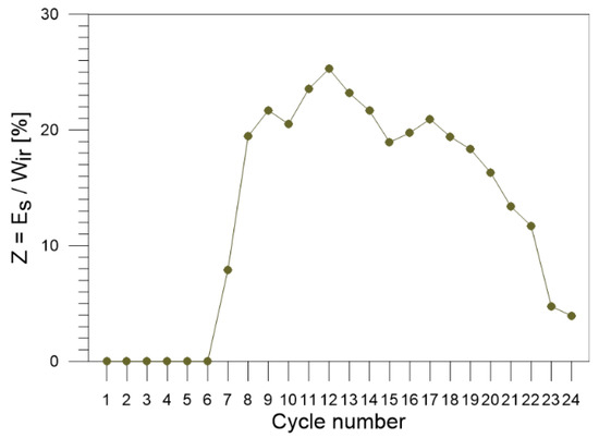 The measure of the energy conversion at each instant of the plastic deformation process starts at cycle 6, equals approximately 8% for cycle 7 and 20% for cycle 8, increases to 26% for cycle 12 and, in general, remains in the range between 13% and 20% for cycles 8–18. In the last cycles, i.e., in the stage close to the Gum Metal specimen rupture, the values of the estimated ratio Z gradually decrease to zero.