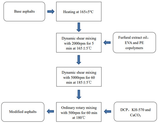 Firstly, the base asphalt was heated to 160 ± 5 °C in an oil bath to soften the asphalt to a fluid state. The weighed PE, EVA, and furfural extraction oil were separately poured into the base asphalt, preheated, and sheared at 2000 r/min for 5 min with a high-speed shear to produce PE, EVA, and furfural extraction oil, which were initially melted and dispersed to prevent accumulation. After that, the temperature and shear rate were increased to 180–190 °C and 5000 r/min, respectively, and the mixture was sheared again for 60 min. Finally, the modified asphalt obtained from the high-speed shear was cooled down to 160 ± 5 °C. DCP, KH-570 and CaCO3 were added one-by-one, and the temperature was maintained at 175 °C in a temperature-controlled electric heating jacket. The developed mixture was stirred with an electric mixer for one hour to obtain PE/EVA-modified asphalt. The process of preparing specimens is displayed in Figure 1.