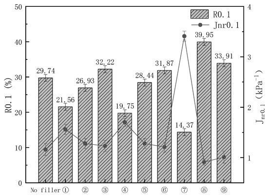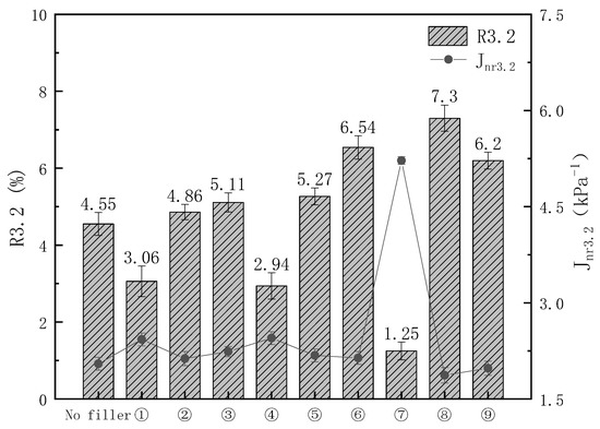 In the MSCR test, the effect of damage to the material at high temperatures can be determined [33]. The average of 10 cycles at a temperature of 64 °C was used as the creep recovery rate (R0.1 and R3.2) and the irrecoverable creep flexibility (Jnr0.1 and Jnr3.2) at each stress level, where the lower the Jnr value, the better the resistance of the modified asphalt to permanent deformation.