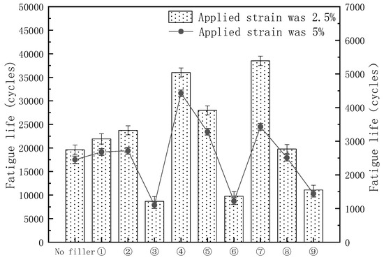 Fatigue life of different kinds of modified asphalt under the conditions of two applied strains.