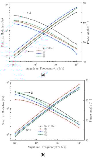 A frequency sweep test was conducted to determine the linear viscoelastic mechanical properties of modified asphalt under specific temperature and frequency conditions. The frequent sweep results of the modified asphalt are presented in Figure 6.