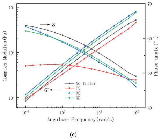 The G* decreased and increased with the increase in frequency, indicating an increase in vehicle speed, and asphalt has more rigid and elastic properties. In Figure 6a–c, it is evident that the G* and δ of sample 9 are smaller than the base asphalt. Once again, a viscoelastic failure prompted by a small DCP to KH-570 ratio is demonstrated. In addition, samples 2, 4, and 8 have relatively large G* and small δ, indicating a reduction in shear deformation resistance above 0.03% for DCP or KH-570 and a reduction in the degree of transition from viscous body to elastomer. The overall higher δ observed in Figure 6b,c compared to Figure 6a suggests that the increase in furfural extracted oil was able to improve the elasticity of the modified asphalt.