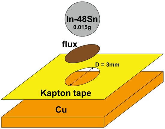 As shown in Figure 1, the amount of solder used was 0.15 (±0.001) g, and the circular reaction area had a diameter of 3 mm. The copper substrates were cleaned with sulfuric acid and isopropanol solutions. Halogen-free flux and Kapton tape with a temperature resistance exceeding 150 °C were used for sample preparation.