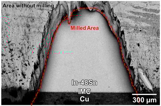 The alloy sample was metallographically polished prior to cross-sectional observation. However, during mechanical polishing, the silicon carbide particles on the sandpaper and diamond abrasives in the polishing fluid were embedded in the soft In-Sn alloy. It has been reported that ion milling can be used in place of mechanical polishing for samples that are damaged by mechanical polishing [24]. An ion milling system (Hitachi, IM4000Plus, Tokyo, Japan) equipped with a liquid-nitrogen cryogenic system was used to prevent the In-48Sn solder in the sample from melting due to the heat generated during the ion milling process.