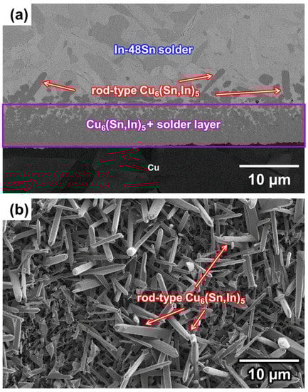 The In-48Sn/Cu sample was soldered at 150 °C for 80 min, followed by water quenching. The cross-section of the interface is shown in Figure 3a, and the top-view morphology of the IMCs after all the In-48Sn solder was removed by the etching solution is shown in Figure 3b. As shown in Figure 3, there are two distinct microstructure regions at the interface. The region in contact with the solder has a large quantity of rod-type IMCs, while the region in contact with the substrate is composed of a solder/IMC mixture. Similar observations have been reported in the solid–liquid reaction in Cu/In binary systems [24]. There are differences in the interface shape and phase of the IMCs between the In-48Sn/Cu and Cu/In systems. According to EDS quantitative analysis, the elemental composition of the IMC in both microstructures can be described as 56Cu-18In-26Sn (at.%), indicating that it is most likely to be Cu6(Sn,In)5 rather than Cu2(In,Sn). This result will be confirmed using EPMA and XRD analysis, as discussed below.