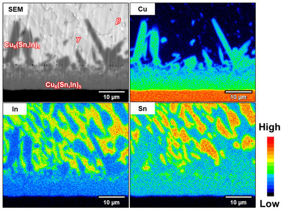 The EPMA elemental mapping and quantitative analysis are shown in Figure 4 and Table 1, respectively. The In-48Sn solder matrix was separated into β and γ phases, which is consistent with the reported In-Sn phase diagram [25]. As mentioned above, the elemental composition of the IMC in the mixed layer and the rod-type IMC is Cu6(Sn,In)5.