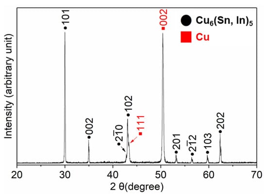 XRD analysis was used to confirm the crystallographic structure of the IMC at the interface; the obtained diffraction pattern is shown in Figure 5. The remaining solder was completely etched; therefore, all of the peaks in the XRD pattern were from the IMCs and substrate. As shown in Figure 5, only Cu6(Sn,In)5 and Cu peaks are present. This confirms that the chemical composition of both the rod-type IMCs and IMCs in the mixture layer is Cu6(Sn,In)5, which is consistent with the results of the EPMA quantitative analysis. The appearance of several weak peaks in the XRD pattern can help distinguish whether the appearance of the IMC belongs to the η-Cu6Sn5 or η’-Cu6Sn5 phase. Weak peaks would indicate monoclinic η’-Cu6Sn5, as it has relatively poor symmetry [12,23,24,26]. As shown in Figure 5, no monoclinic peaks can be observed from the XRD pattern, meaning that the Cu6(Sn,In)5 at the interface is the high-temperature phase of η-Cu6Sn5. This result is consistent with previous work, which found that the addition of In stabilized the high-temperature phase η-Cu6Sn5 at room temperature [26]. The results show that each diffraction peak from Cu6(Sn,In)5 slightly deviates from In-free η-Cu6Sn5. This is caused by a change in the interplanar spacing due to the replacement of Sn by In. The crystallographic structure information of Cu, η-Cu6Sn5, and η’-Cu6Sn5 is from the Joint Committee on Powder Diffraction Standards (JCPDS) data file numbers 04-0836, 02-0713, and 45-1488.