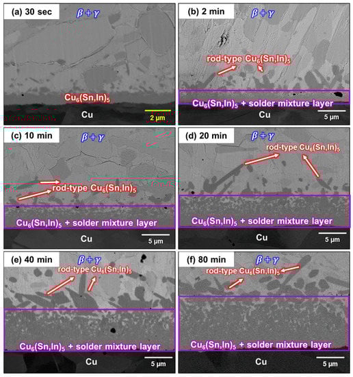 As mentioned previously, there are two different microstructures at the interface: rod-type Cu6(Sn,In)5 and a solder/Cu6(Sn,In)5 mixture layer. The cross-section microstructure evolution of the liquid–solid reaction after soldering at 150 °C for 0.5 min, 2 min, 10 min, 20 min, 40 min, and 80 min is shown in Figure 6a–f. As shown in Figure 6, the thickness of the solder/Cu6(Sn,In)5 layer formed during soldering increased with time. Furthermore, there is a non-uniform distribution in the solder/Cu6(Sn,In)5 mixture layer, especially during long-term soldering. This non-uniformity can be described as Cu6(Sn,In)5 dissolved in molten In-48Sn. While Sn and In diffuse downward to form Cu6(Sn,In)5, In-48Sn solder simultaneously dissolves Cu6(Sn,In)5. This can explain why the proportion of Cu6(Sn,In)5 decreases as it moves toward the In-48Sn solder.