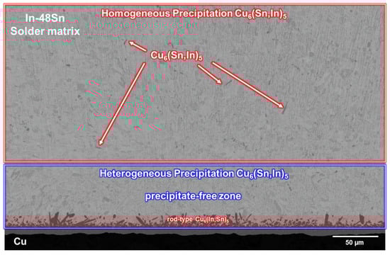 To investigate the formation of rod-type Cu6(Sn,In)5 at the interface, the sample after soldering at 150 °C for 80 min was observed with a low magnification SEM image, as shown in Figure 7. In addition to the rod-type Cu6(Sn,In)5 precipitates at the interface, water quenching results in some sporadic rod-type Cu6(Sn,In)5 precipitation in the In-48Sn solder matrix far away from the interface. A precipitate-free zone could be observed above the In-48Sn/Cu interface. These results indicate that rod-type Cu6(Sn,In)5 forms during the cooling process, which is caused by a decrease in Cu solubility in the In-48Sn solder after solidification. During solidification, excess Cu in the In-48Sn solder precipitates. Cu close to the interface is then able to move to the interface and form heterogeneous precipitates when water quenching is applied. On the other hand, Cu that is far from the interface is only able to homogeneously precipitate in situ when quenched with water. However, Cu near the interface is still able to form heterogeneous precipitation. This allows a precipitate-free zone between the heterogeneous precipitation and homogeneous precipitation regions to form.