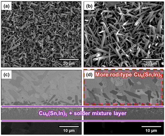 To understand the relationship between Cu concentration and precipitation, the amount of solder was reduced to 0.075 g, while the reaction area was held constant. Just as was performed above, the sample was soldered at 150 °C for 80 min. Figure 8a,b show the top-view morphology, while Figure 8c,d show the interface cross-sections of the two samples prepared with different amounts of solder. According to the cross-sectional microstructure and the position of the Cu6(Sn,In)5/Cu interface, the total Cu consumption is consistent between the two samples. This is because the Cu concentration in In-48Sn is well below the saturation concentration, and, therefore, the dissolution rate and amount of Cu6(Sn,In)5 are related to the soldering time rather than Cu concentration. Because Cu dissolved in In-48Sn is equal to Cu consumption, and Cu exists as Cu6(Sn,In)5, these two samples have the same Cu consumption and amount of Cu6(Sn,In)5. This indicates that the total Cu in both amounts of In-48Sn solder is the same. The molten In-48Sn solidified as β and γ phases when cooled to room temperature (25 °C). Because Cu is almost completely insoluble in both the β and γ phases, the supersaturated Cu in the solder matrix precipitates in the form of Cu6(Sn,In)5 after cooling. Based on these observations, the Cu concentration in the sample using 0.075 g of solder was twice that of the sample using 0.15 g of solder. This increase in Cu concentration results in denser rod-type Cu6(Sn,In)5 heterogeneous precipitation at the interface (Figure 8d). Conversely, the sample using 0.15 g solder has more homogeneous precipitation in its solder matrix (Figure 8c). Furthermore, the sum of the heterogeneous and homogeneous precipitation remains the same between the two samples.