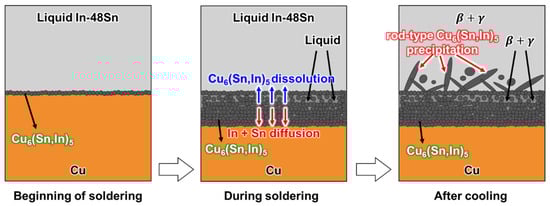 A schematic of the proposed mechanism for the interfacial reaction between the liquid In-48Sn and solid Cu at 150 °C is illustrated in Figure 9. At the beginning of soldering, a thin Cu6(Sn,In)5 layer forms at the In-48Sn interface. Then, the Cu6(Sn,In)5 layer continues to grow and is simultaneously dissolved by the molten In-48Sn solder as soldering proceeds. Finally, rod-type Cu6(Sn,In)5 precipitates after cooling due to the difference in Cu solubility between liquid and solid In-48Sn.