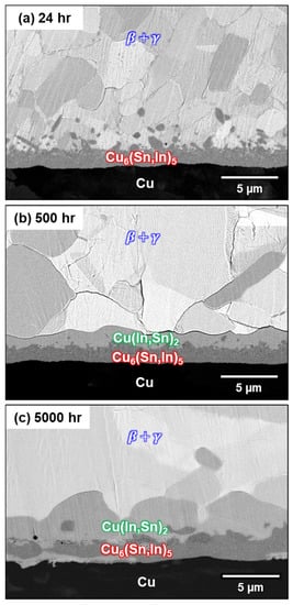 A previous study reported the formation of both Cu6(Sn,In)5 and Cu(In,Sn)2 IMCs during soldering at 160 °C. However, the formation of Cu(In,Sn)2 at the interface after soldering at 150 °C was not observed in this study. It is possible that Cu(In,Sn)2 was not formed during soldering but during room-temperature storage. Because 25 °C is approximately 0.7 times the melting temperature of In, it has been shown to have an apparent creep at room temperature [27,28]. The diffusion of In at room temperature is relatively fast; therefore, interfacial reactions may take place, even at room temperature. To determine the effect of room-temperature storage, the as-bonded samples were stored at room temperature for different amounts of time. The cross-section of the interface after room-temperature storage for 24, 500, and 5000 h is shown in Figure 10a–c. In the sample aged for 24 h, only the Cu6(Sn,In)5 continuous layer and rod-type Cu6(Sn,In)5 are present at the interface. However, there is no longer rod-type Cu6(Sn,In)5 in the sample stored for 500 h. In contrast, a Cu(In,Sn)2 continuous layer formed between the solder matrix and the Cu6(Sn,In)5 layer. After 5000 h of storage at room temperature, the thickness of the Cu(In,Sn)2 continuous layer increases, and Cu6(Sn,In)5 becomes a discontinuous layer. This experiment demonstrates that the Cu(In,Sn)2 continuous layer formed during room-temperature storage after soldering, which was first reported in the Cu-In-Sn system. This storage process causes unintentional IMC growth under room temperature; hence, this phenomenon is called room-temperature aging.