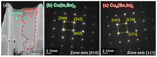 Figure 12a shows a TEM bright-field image of both Cu6(Sn,In)5 and Cu(In,Sn)2. The SAED patterns of the Cu(In,Sn)2 (b) and Cu6(Sn,In)5 (c) regions are shown in Figure 12b,c, respectively.