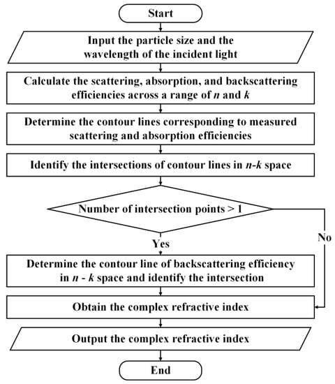 The contour intersection method visualizes various optical parameter spaces as functions of n and k and looks for intersections in the curves defined by optical measurements. [30] The specific process of this method is shown in Figure 1. Firstly, the light scattering, absorption and backscattering efficiencies of nanoparticles with a given wavelength and diameter across a range of n and k are calculated. Then, the contours corresponding to measured scattering and absorption efficiencies are determined. Finally, intersection points on the contour line of the scattering and absorption efficiencies in n-k space are identified. If there is only one intersection point, the result is output, and the relative error is calculated. If multiple intersection points exist, the backscattering efficiency is added to constrain the unique solution. The scattering, absorption, and backscattering efficiencies of particles can be calculated using Mie theory.