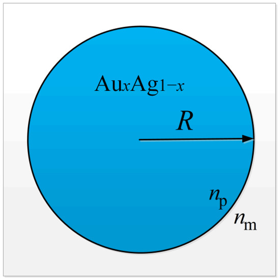 For the Au-Ag alloy nanospheres, R represents the particle radius, x represents the molar fraction of gold, np is the particle refractive index, and nm is the refractive index of the surrounding medium, as shown in Figure 2.