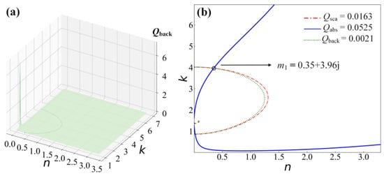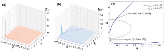 In order to solve the problem of multiple inversion effective solutions when only Qsca and Qabs are specified in the actual operation, the contour line of Qback is added to n-k space, as shown in Figure 4a. Finally, the contours of Qsca, Qabs, and Qback are identified and projected onto the n-k space. The results show that adding Qback can acquire a unique solution, as shown in Figure 4b.