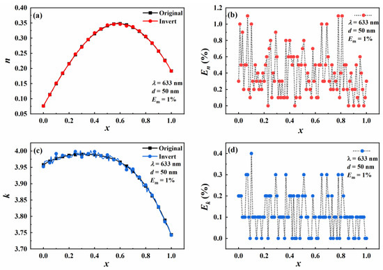 En and Ek are the relative errors in the real and imaginary parts of the complex refractive index. ni and n0 are the inversion value and original value of the real part of the complex refractive index. ki and ko represent the inverse value and the original value of the imaginary part of the complex refractive index.