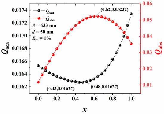 Scattering and absorption efficiencies of Au-Ag alloy nanosphere with respect to the Au molar fraction.