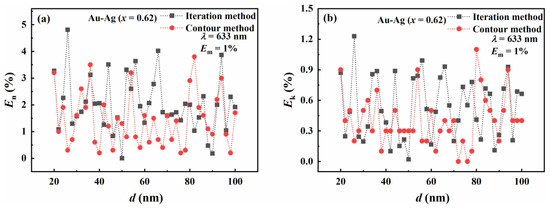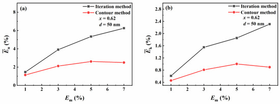 The average relative errors in the inversion results of the contour intersection method and the iterative method with respect to Em. The average relative errors in the real (a) and imaginary (b) parts of the refractive index at an Au molar fraction of 0.62.