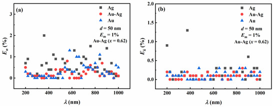Additionally, the real part of the complex refractive index of gold–silver alloy and pure silver is greater than that of pure gold. It shows that the particle size dramatically influences the real part of the complex refractive index but has little effect on the imaginary part of the complex refractive index. The proportion of silver in gold–silver alloy greatly influences the imaginary part of the complex refractive index. Figure 8d presents the relative errors in the inversion of the imaginary part of the complex refractive index. Figure 8d shows a similar trend to those in Figure 8b. The relative errors in both figures are less than 1.2%. The difference in the relative errors of the real and imaginary parts of the complex refractive index is that the particle size has different effects on the particle scattering and absorption efficiencies, resulting in different accuracy of the inversion results.