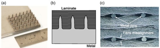 Development of new joining methods is vital to promote applications of composite materials in aerospace and automotive structures. Hybrid joining techniques such as bonding plus bolting [7,8], interleaving [9,10,11,12] and surface structuring [6,13,14,15] have been developed, offering some compromise between reduced weight and increased structural redundancy. To avoid drilling fastener holes in composites, surface-structuring technology has attracted much attention. It is a combination of adhesive bonding and mechanical reinforcement by inserting small metal pins into the composite laminate to form an “interlocking system” to bridge debonding cracks, consequently increasing the resistance to fatigue crack growth rate. These through-thickness reinforcements with either metallic or fibre-polymer pins (referred to as micro pins) are typically 0.28–1.5 mm in diameter, to join two similar or hybrid materials together [16]. A variety of reinforcement pins have been developed over the past decades. The Surfi-Sculpt™ technique used protruded or sculpted surface features such as blunt pins made with a laser beam [13,14]. Pins can also be made by additive manufacturing [6,17], arc welding (cold metal transfer, CMT [15,18,19]), cold discharge stud weld (CDSW) [20] or sheet pins [21]. The hybrid penetrative reinforcement (HYPER) pin is one such technology that involves using small pins that are built onto a titanium substrate by additive manufacturing. HYPER pins only penetrate partway through the thickness of the laminate, providing an aerodynamic benefit compared to even a countersunk fastener. The sheet pins are produced by stamping a specific pattern on a metal sheet and then rotating the reinforcing elements perpendicular to the substrate, which has the advantage of having the reinforcement element unaffected by mechanical or thermal stresses during manufacturing [22].