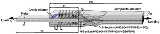 Test specimens representing the pin-reinforced lap joint were fabricated and tested [18]. Figure 2 shows the specimen geometry and dimensions. An unreinforced joint was also tested as a baseline to evaluate the effect of the pins. The test method was informed by ASTM D5868, with adaptation of a larger interface area to accommodate pin array patterns. Carbon-fibre epoxy prepreg (Hexcel Corporation HexPly® T700/M21, Hexcel, Duxford, UK) and steel alloy AISI 304 were used to fabricate the joints. The adhesive bond was strengthened with pins arranged in a 5 × 7 array. Spike-headed pins of 0.8 mm diameter and 4 mm height were welded onto the surface of the metallic part using the Fronius International GmbH CMT pin process [37]. The metal part of the overlap was sand-blasted to improve the adhesion between the composite and metal part. The composite part forms the middle section (M-section) and two side sections (S-section); it has quasi-isotropic layups: [0/45/90/−45/0/45/−45/0/−45/90/45/0] for the “M” and [0/45/90/−45/0/45/90/−45/0]S for the “S” sections. Nominal ply thickness was 0.25 mm. An initial crack of 5 mm length was created by inserting a thin FEP (fluorinated ethylene propylene) film at the runout of the composite part, as indicated in Figure 2. A Branson ultrasonic horn with a ‘hammer’ attachment was used to insert the pins into the prepared laminate, which did not cause damage to the fibres (Figure 3a). The assembled specimens were then enclosed within a vacuum bag and cured in an autoclave, following the manufacturer’s specified cure schedule of 150 °C for 180 min, followed by 180 °C for 180 min, under an autoclave pressure of 7 bar throughout (Figure 3b). The prepreg epoxy matrix system was used as the joint adhesive, therefore forming a co-bonded joint simultaneously during the laminate cure cycle (Figure 3c).