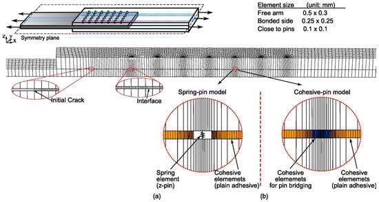 The pin bridging law, Equation (1), was implemented in the global FE model of the joint specimen using two different single-pin models representing the nonlinear and bilinear bridging laws, as shown in Figure 6 inserts (a) and (b), respectively. The “spring pin” model employs nonlinear spring elements with a user-defined force–displacement relation representing the nonlinear curve in Figure 5b. As depicted in Figure 6a, these springs are connected to the two adherends through the multiple-point constraints. The “cohesive pin” model represented by a bilinear traction–separation law using cohesive interface elements, Figure 6b, is easier to implement in the commercial software package ABAQUS. The suitability of these two different single-pin models is discussed in Section 4. The plain adhesive was modelled by cohesive elements with the cohesive properties in Table 1.