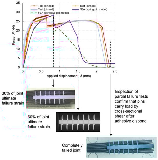 Predicted force vs. displacement relations and comparison with tests. Inserted images show the pins at various stages of the test, demonstrating that the pins carried the load after the initial debonding. (Metal adherend thickness 3 mm).