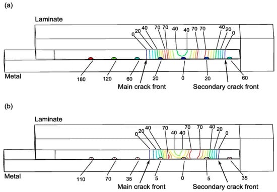 Figure 8 shows the interlaminar shear stresses at the bonding plane, with an applied displacement of 0.65 mm (main crack length 14 mm). Higher stresses were predicted by the cohesive-pin model on the pin rows close to the crack tip, owing to the bilinear cohesive-pin model being stiffer than the spring-pin model before the force reaches its peak (Figure 5b). It is worth noting that the pin stresses in Figure 8 should not be interpreted as the pin internal stress, but rather as an equivalent stress derived from dividing the bridging force by the pin cross-sectional area. The figure reveals the crack growth retardation mechanism of the pins’ traction forces in the crack wake (left side of the main crack front) picking up higher stresses. It also shows the failure behaviour of the joint, i.e., as the applied load increases, a secondary debond crack initiates at the other runout and propagates toward the main crack front. Final failure occurs when the two crack fronts meet at the centre of the joint. This behaviour is predicted by both the cohesive-pin and the spring-pin models.