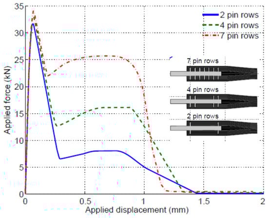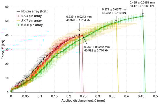 Load vs. applied displacement showing the effects of pin array: no pin array (Ref.), 5 × 4 pin array, 5 × 7 pin array, 6-5-6 pin array. Metal adherend thickness 6 mm.
