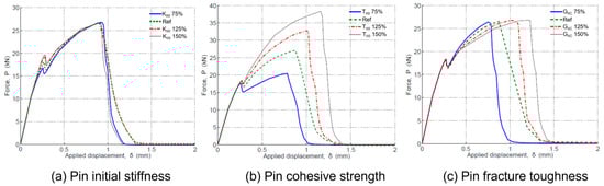 As described before, the pin traction–separation laws can be characterised by three parameters: the initial stiffness (), the cohesive strength () and fracture toughness (). A sensitivity study of these parameters was performed by FEA to understand how the variation in a single-pin parameter affects the response of a joint.