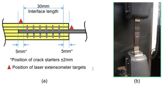 (a) Diagram showing details of the cross-section of the modified joint interface along the length of tensile adhesive joint test specimen, with the positions of the laser extensometer reflective targets; (b) the arrangement of the test setup.