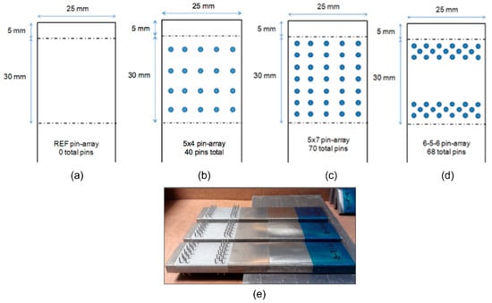 Schematics of micro-pin array patterns used in the experimental study: (a) no pins (Ref.), (b) 5 × 4 pin array, (c) 5 × 7 pin array, (d) 6-5-6 quincunx pin array, (e) the metal parts prior to joining with laminate in experiment.