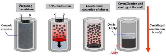 - Sanin, V.; Andreev, D.; Ikornikov, D.; Yukhvid, V. Cast Intermetallic Alloys and Composites Based on Them by Combined Centrifugal Casting—SHS Process. Open J. Metal. 2013, 3, 12–24. [Google Scholar] [CrossRef]