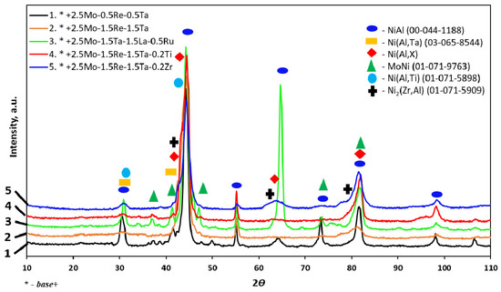 - Cast alloys based on NiAl-Cr-Co (base+) with complex dopants added (base+2.5Mo-0.5Re-0.5Ta, base+2.5Mo-1.5Re-1.5Ta, base+2.5Mo-1.5Ta-1.5La-0.5Ru, base+2.5Mo-1.5Re-1.5Ta-0.2Ti, and base+2.5Mo-1.5Re-1.5Ta-0.2Zr) were fabricated by centrifugal SHS metallurgy.