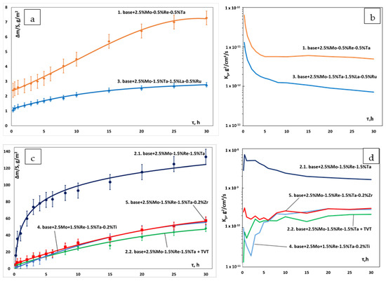 - The positive effect of vacuum pre-annealing of ingots on their high-temperature oxidation resistance was observed for the base+2.5Mo-1.5Re-1.5Ta+(TVT) alloy as an example. The total weight gain of the annealed samples after the tests decreased threefold: from 120 ± 5 g/m2 to 40 ± 5 g/m2.