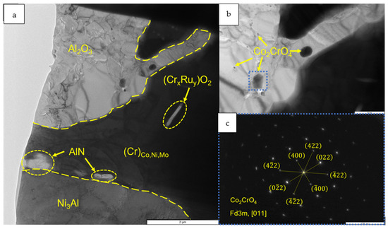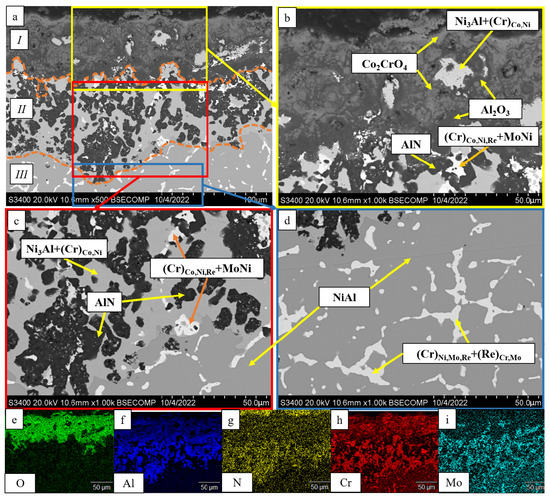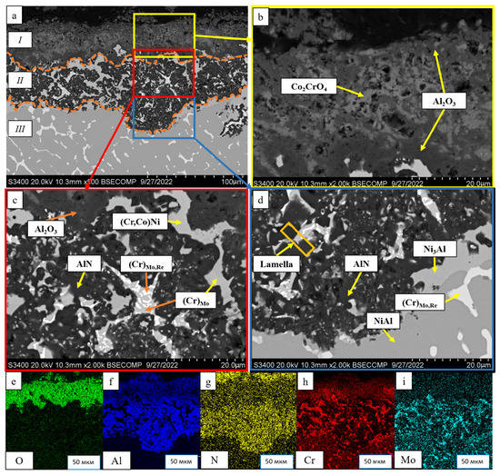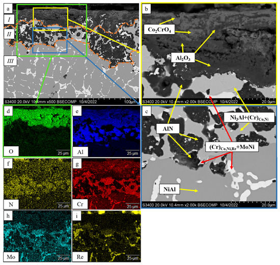 - The kinetics and the mechanism of oxidation of alloys at T = 1150 °C were studied; the kinetic regression equations describing the oxidation law were plotted. Al2O3 and Co2CrO4 are the major phases in the oxidized layer. Three layers were found to be formed: I—the continuous Al2O3 layer with Co2CrO4 inclusions; II—the transitional MeN-Me layer with AlN inclusions; and III—the metallic layer with local AlN inclusions.