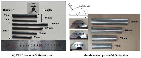 The two parts of the upper and lower semicircular aluminum plates (A6061-T6, yield strength of 230 MPa) with grooves were manufactured to simulate a wedge. To avoid loading failure caused by contact between the upper and lower plates during the loading process, a sufficient gap should be left between the plates. As shown in Table 1 and Figure 1b, the gaps between the aluminum plates were 1.4, 1.8, and 2.2 mm for CFRP tendon specimens of 5, 7, and 9 mm, respectively. The length of the aluminum plate was the same as that of the CFRP tendon specimen, as shown in Figure 1b. In transverse compression testing, three influencing factors, tendon diameter, length, and aluminum plate, were considered. The geometric details and the number of CFRP tendons and aluminum plate specimens are listed in Table 1.