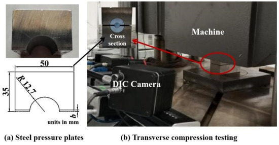 As shown in Figure 2a, a pair of steel plates with cross-sectional dimensions of 35 mm × 50 mm were used to transfer the load from the testing machine to the aluminum plate and CFRP tendon specimens. The material of the steel plate was 42CrMo (after annealing) with a yield strength of 930 MPa and a hardness of 50–60 HRC to ensure sufficient rigidity. A groove that matched the outer diameter of the semicircular aluminum plate was created in the steel plate. As shown in Figure 2b, in transverse compression testing, the CFRP tendon, aluminum plate, and steel plate were assembled on a servo-hydraulic testing machine (1000 kN capacity) and loaded to failure at a loading rate of 1.5 mm/min [25]. The vertical strain of the CFRP tendon end-face and the full-field strain of the end-face of the CFRP tendon and aluminum plates were measured using DIC during the entire loading process. The gauge length of the vertical strain was defined as the diameter of the tendon end-face parallel to the applied loading direction. The end-face of the CFRP tendon and aluminum plate were sprayed spot to cooperate with the DIC technique.