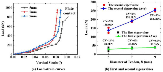 As shown in Figure 4a, the load–strain curves (triplicate-average results) of the CFRP tendons with diameters of 5, 7, and 9 mm exhibited the same trend. The load–strain curves almost overlapped at the beginning. As the load increased, the slope of the load–strain curve increased for the larger-diameter CFRP tendons. This means that the cross-section of the tendons with a larger diameter had better resistance to deformation under the same transverse load. Additionally, the CFRP tendons with different diameters exhibited the same deformation and damage mode characteristics under a transverse load. Based on the three-stage division method of the load–strain curve, the first and second eigenvalues were recorded for all the specimens, as shown in Figure 4b. The first and second eigenvalues increased approximately linearly as the diameter increased. This also demonstrates that the cross-section of tendons with a larger diameter had better resistance to deformation. Because the crack occurred in the third stage, local material damage is more likely to occur in tendons with smaller diameters under the same transverse load. For the first and second eigenvalues, the coefficient of variation (CV) of the 5 mm diameter specimens was significantly larger than that of the 7 and 9 mm diameter specimens. In summary, the large-diameter CFRP tendons exhibited better cross-sectional deformation resistance and more stable transverse mechanical properties.