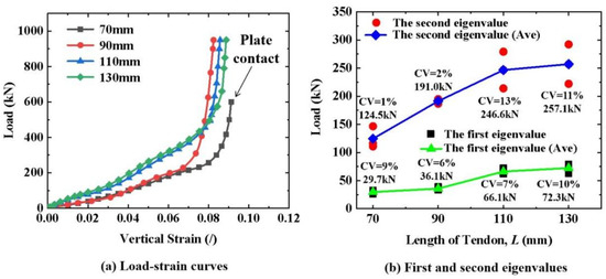 As shown in Figure 5a, the load–strain curves (triplicate-average results) of the 7 mm diameter CFRP tendons with different lengths exhibited the same trend. The load–strain curves for the 110 mm- and 130 mm-long tendons almost coincided. Moreover, they had a larger slope compared to those of the 70 mm- and 90 mm-long tendons. Therefore, the cross-section of the tendons with 110 mm and 130 mm lengths had better resistance to deformation under the same transverse load. This resistance to deformation did not increase when the length was greater than 110 mm. Although the first and second stages of the load–strain curve for the 90 mm-long tendon coincided with that of the 70 mm-long tendon, the sharply rising section of the load–strain curve had the same characteristics as those of the 110 mm- and 130 mm-long tendons. This means that the aluminum plates also had an excellent grip on the 90 mm-long tendon. The CFRP tendons of different lengths had the same deformation and damage mode characteristics under a transverse load. The statistical results of the first and second eigenvalues showed characteristics consistent with the load–strain curves. For the first eigenvalue, those of the 110 mm- and 130 mm-long tendons were significantly higher than those of the 70 mm- and 90 mm-long tendons. The second eigenvalue increased approximately linearly as the length increased, until the length was greater than 110 mm. The 90 mm-long tendons had more stable transverse mechanical properties than the tendons of other lengths owing to their having the smallest CV of the first and second eigenvalues. Considering these two factors of cross-sectional deformation resistance and mechanical stability, it is recommended to use 90–110 mm-long CFRP tendons.