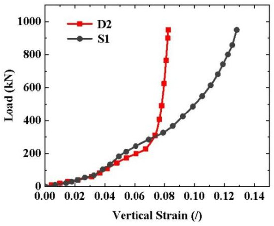 The typical load–strain curve (triplicate-average results) of the CFRP tendon (D2) in transverse compression is shown in Figure 3. The curve can be divided into three stages according to the characteristics of the strain distribution on the end-face of the tendon.