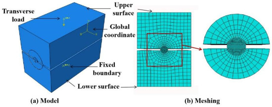 A three-dimensional FEM was built using the commercial software Abaqus 2020 to simulate transverse compression testing. As shown in Figure 7a, the coordinate system was established with the axial direction of the CFRP tendon along the Z direction and the radial direction in the X and Y directions. The CFRP was set as an orthotropic material [26,27], and the aluminum and steel plates were assumed to be linearly elastic materials, as shown in Table 3. To simulate the contact behavior of the CFRP tendon–aluminum plate and the aluminum plate–steel pressure plate, surface-to-surface contact with limited sliding and a specific friction coefficient of 0.24 [28,29] were set. An eight-node linear brick with reduced integration and an hourglass-control (C3D8R) element were used for the CFRP. The model was fixed by applying a Y-direction constraint to the lower surface of the steel pressure plate. The transverse compression load was set as the reference point of the upper steel pressure plate. As shown in Figure 7b, the meshing size of the cross-section of the steel pressure plate and the CFRP tendons were 3 mm and 0.5 mm, respectively. The meshing size gradually transitioned from 3 mm to 0.5 mm from the outer surface to the inner surface for the cross-section of the aluminum plate.
