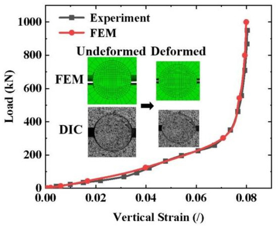 Comparison of the load–strain curve and deformation between the FEM and the experimental results.