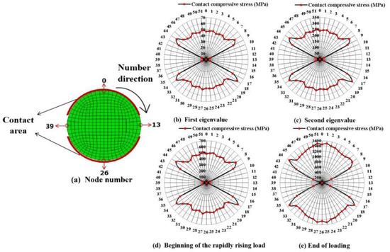 The contact compressive stress distribution and the magnitude of the contact surface between the tendon and aluminum plate groove under different loads, including the first eigenvalue (36 kN), second eigenvalue (191 kN), beginning of the rapidly rising load (353 kN), and the end of loading (1000 kN), were investigated for a typical specimen (CFRP tendons with a 7 mm diameter and 90 mm length) through the FEM. As shown in Figure 10a, 52 nodes were numbered on the cross-section of the tendon FEM in a clockwise direction according to the mesh size. The contact compressive stress of each node was extracted to plot the envelope, as shown in Figure 10b–e. The distribution pattern of the contact compressive stress along the circumference of the cross-section was approximately symmetrical and nonuniform. This symmetry weakened as the load increased because of the large and uneven deformation of the tendon and aluminum plates under a large load. In terms of the magnitude of the contact compressive stress, the stress mutation (nodes 8, 18, 34, and 44) and noncontact status (contact stress is 0) appeared near the gap between the aluminum plates, which was caused by the change in the boundary conditions of the tendon at the edge of the aluminum plate groove. By removing the contact stress mutation and 0 values, the average contact compressive stress of the other nodes were 48 MPa, 248 MPa, 490 MPa, and 1378 MPa, respectively, with a CV of approximately 5% under the four typical loads. The corresponding stress mutation values were 63 MPa, 324 MPa, 634 MPa, and 1510 MPa, with discrepancies of 31%, 31%, 29%, and 10%, respectively, compared to their average. Therefore, the degree of contact compressive stress mutation decreased significantly as the load increased. This was because a larger contact area and more stable contact action were obtained through the deformation of the tendon and aluminum plate. When the load increased to the second eigenvalue, no damage occurred to the tendon, and the contact compressive stress on the surface reached approximately 250 MPa, which was already greater than the compressive strength of 125 MPa measured via the standard test method [29]. When the loading stopped, the tendon was able to withstand the transverse load with a very high contact compressive stress of approximately 1500 MPa. The dramatic increase in the load-carrying capacity of the CFRP tendon was caused by the effective circumferential constraint provided by the aluminum plate grooves. Therefore, considering the actual force environment is critical for evaluating the transverse carrying capacity of CFRP tendons in anchorages.